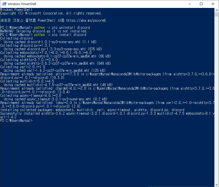 라이브러리가 설치가 시작되게 됩니다. 잠시 후에 다음과 같이 Successfully installed ... 라고 뜬다면 성공적으로 설치된 것입니다.