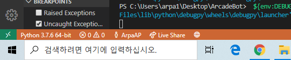 봇이 실행된 상태에는 VS코드 창 밑부분이 주황색으로 변합니다.