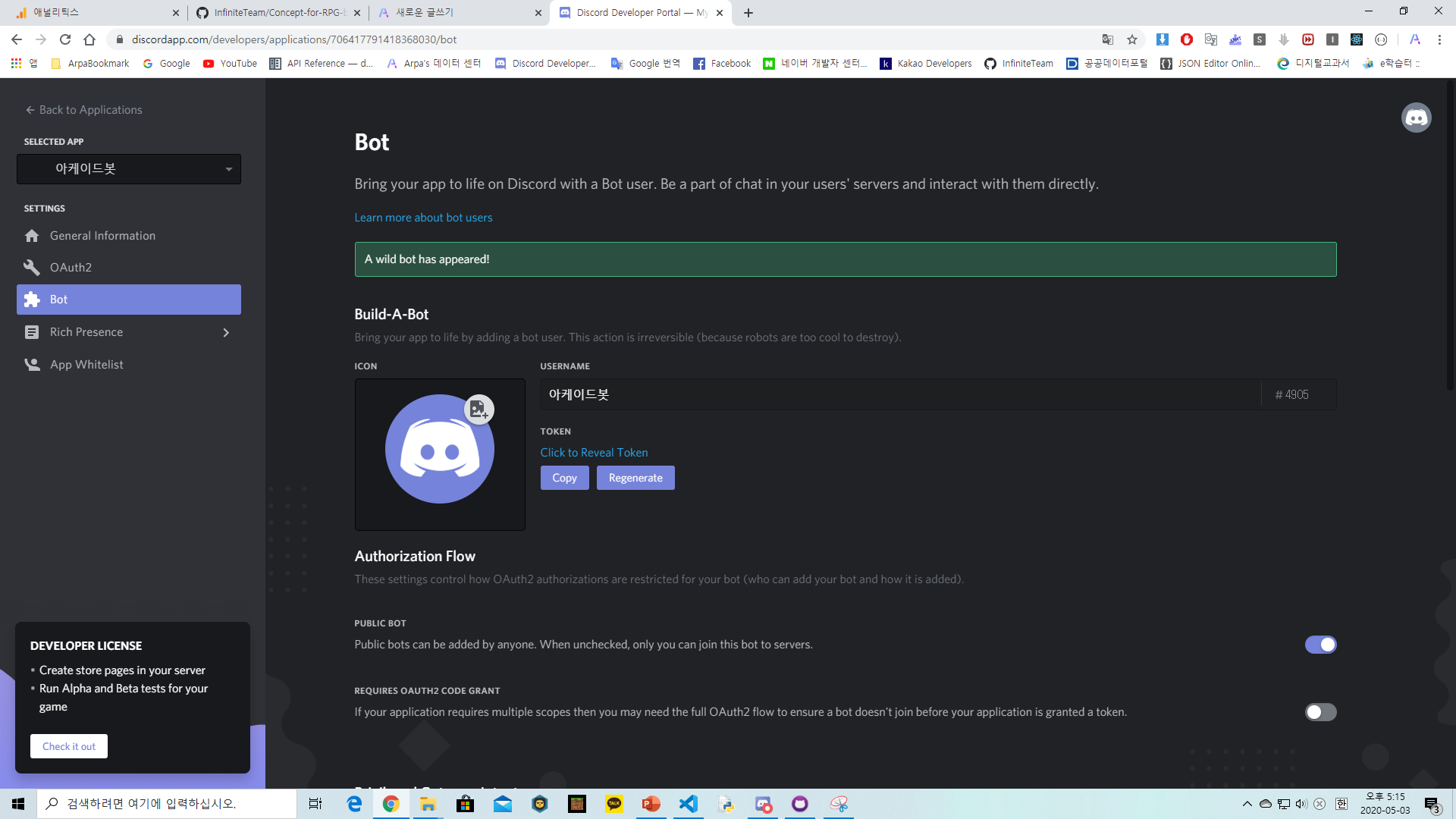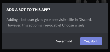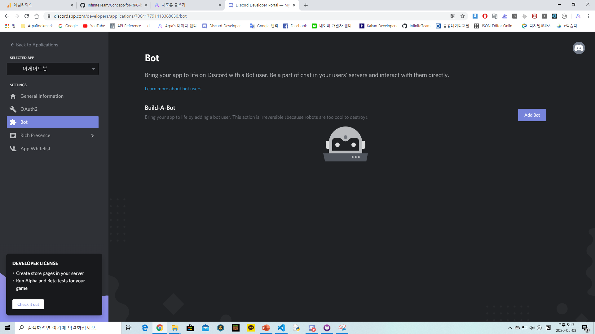 저희는 이 앱을 봇으로 사용할 것이기 때문에, 봇으로 등록해야 합니다. 오른쪽의 Add Bot 버튼을 클릭해서 봇으로 등록해줍니다.