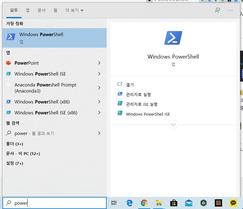 시작메뉴 검색창에서 PowerShell 을 검색하고, 실행합니다.