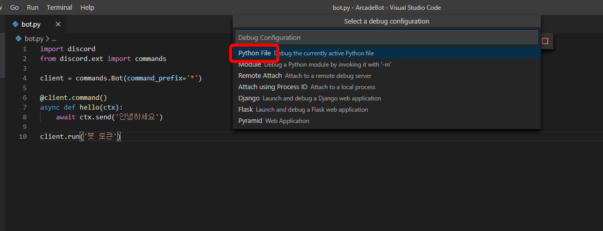 봇 파일이 열린 상태에서 F5 키를 누르면 위와 같이 실행 메뉴가 뜹니다. 여기에서 Python File 을 선택하거나, 그냥 엔터만 눌러도 됩니다.