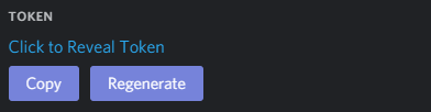 이제 TOKEN 필드 아래의 Copy를 눌러 봇 토큰을 복사해줍니다. 이 토큰은 네이버, 구글 등의 비밀번호와 같습니다. 봇마다 다르게 부여되는 고유한 비밀번호이므로, 절대 노출되지 않아야 합니다. 토큰이 노출되면 다른 사람이 자신의 봇을 조종할 수 있기 때문입니다. 만약 실수로 노출되었다면, Regenerate 버튼을 눌러 봇 토큰을 교체할 수 있습니다.