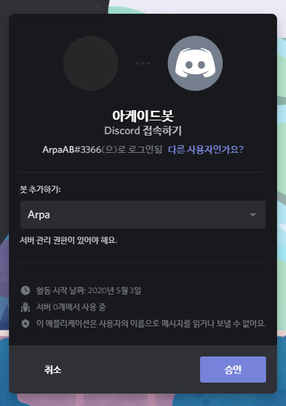 봇 추가하기: 아래의 선택 상자에서 봇을 추가할 서버를 선택합니다. 제 경우는 Arpa라는 이름의 서버에 추가하겠습니다.