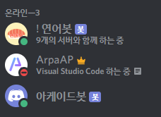 이제 디스코드에 들어가보면, 아케이드봇이 온라인인 것을 볼 수 있습니다.