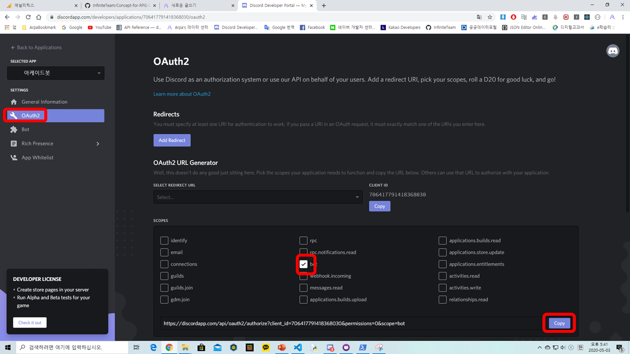 그러면 이제 봇을 서버에 초대해 봅시다. 왼쪽 메뉴에서 OAuth2 탭으로 이동 후, SCOPES 메뉴에서 bot을 선택합니다. 그리고 그 아래에 생성된 주소로 접속합니다.