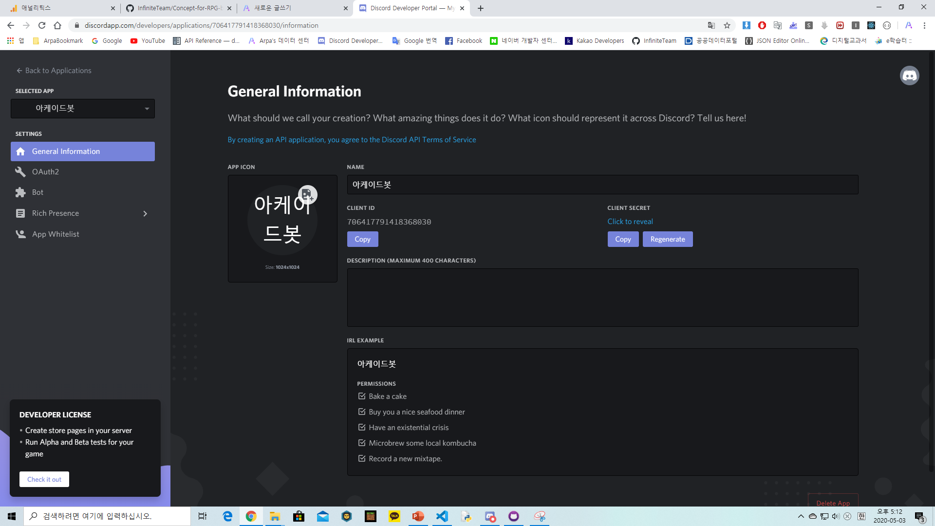 오늘은 봇을 등록해서 서버에 초대하고, 간단한 봇 코드를 실행해 봇을 켜보기까지 했습니다.