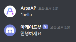 이 코드는 *hello 를 입력하면 '안녕하세요' 를 말하는 코드입니다. 이제 이 코드를 한번 실행해 볼까요?